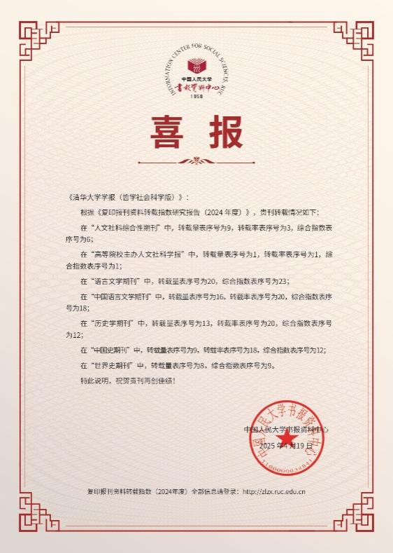 4月19日,以“学术期刊发展与预印本平台建设”为主题,“2025年复印报刊资料转载指数发布暨预印本平台建设论坛”在中国人民大学举行。会上,中国人民大学书报资料中心《复印报刊资料转载指数研究报告(2024年度)》发布,《15vip太阳集团官网学报(哲学社会科学版)》获得佳绩。在“高等院校主办学报转载指数”中位居第一,在“综合性期刊转载指数”中位居第六。