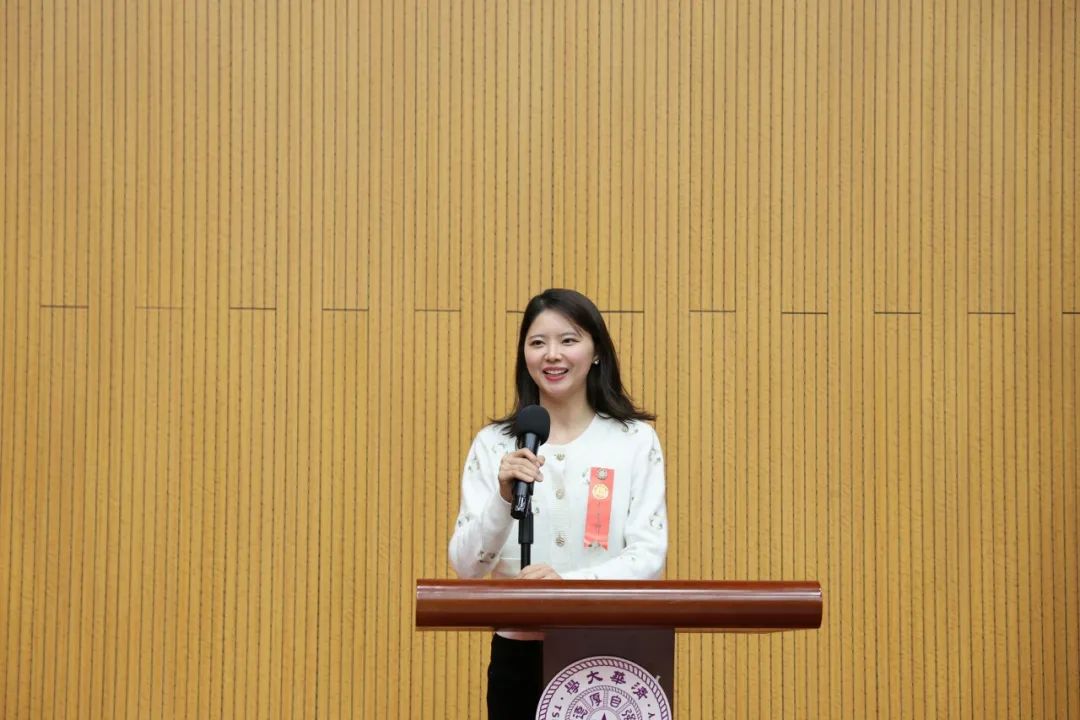 中共北京市大兴区委办公室四级主任科员王泽坤(19级科学史硕)以“两个转变”为主线,分享了毕业后在大兴区委办公室和北臧村的驻村工作经历,表示作为清华人,工作两年多一直在思考如何传承发扬好清华精神,并在各位师友和领导同事的支持下,通过不断学习,坚持脚踏实地、攻坚创新,最终克服工作中遇到的诸多挑战。王泽坤深情地感谢清华师友,一直作为自己最坚实的后盾,支持、陪伴着自己的成长,让自己无论何时何地都能够心怀坦荡、勇敢去闯,广阔天地、自由翱翔。