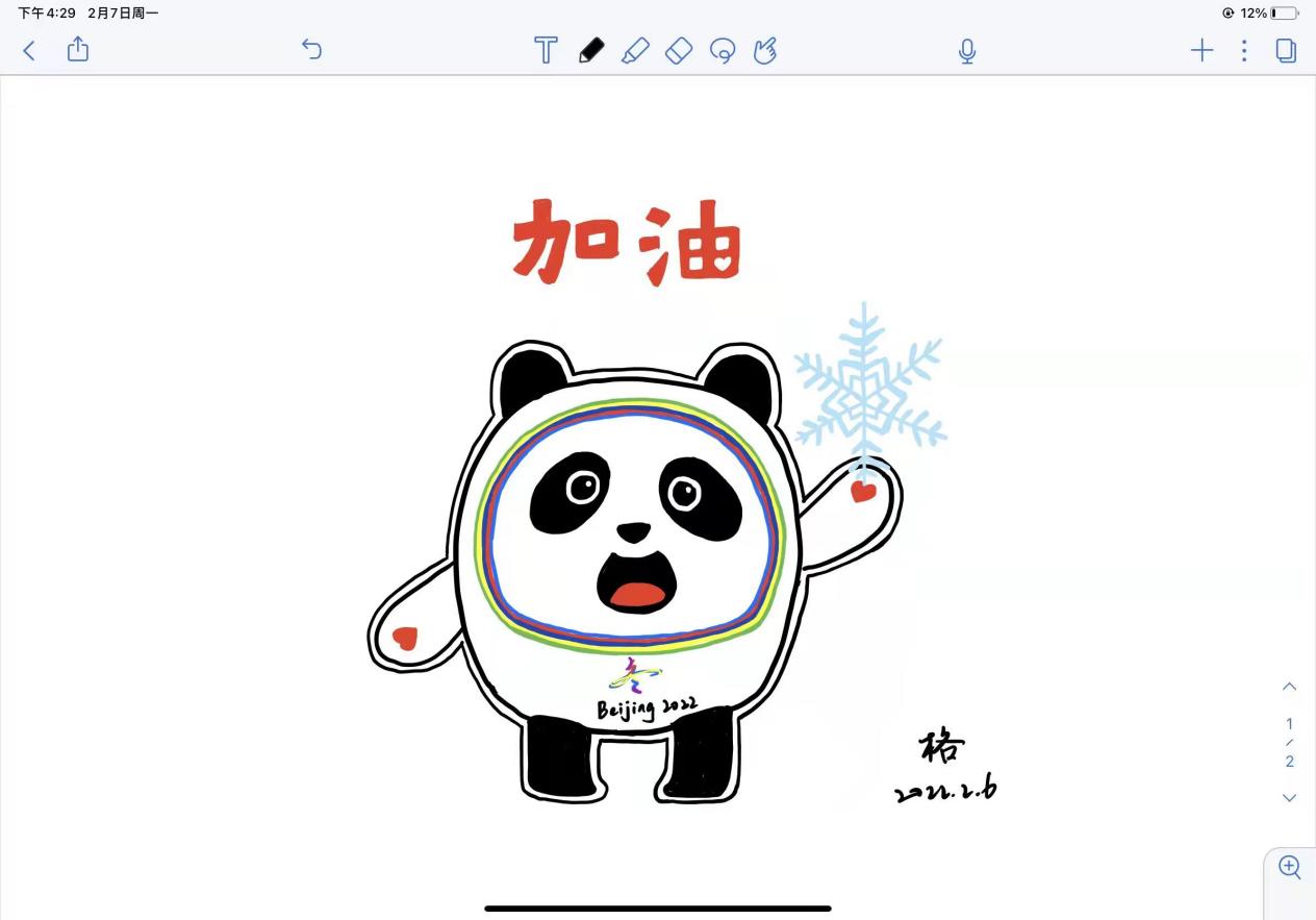 对外联络组志愿者卞格绘制“冰墩墩”,为冬奥加油!