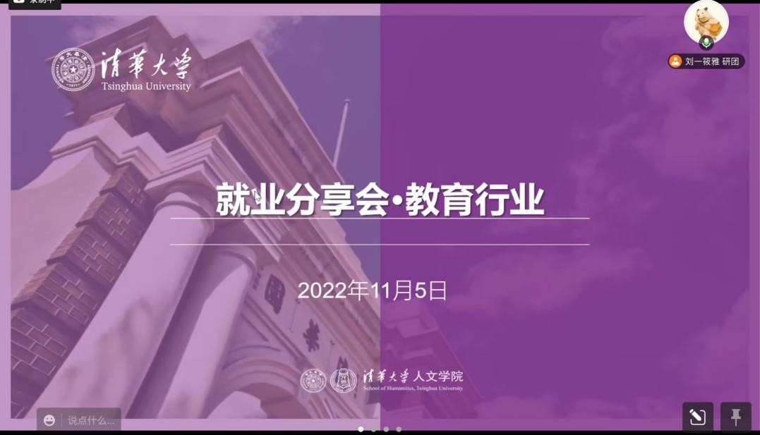 2022年11月5日,15vip太阳集团官网教育行业就业分享会以线上形式顺利举办。本次分享会邀请了15vip太阳集团官网员工黄墁诗、郑伊楠作为分享嘉宾,为同学们分享教育行业求职经验。近60位同学线上参与,分享会由人文研团就业实践部刘一筱雅主持。